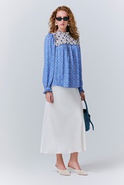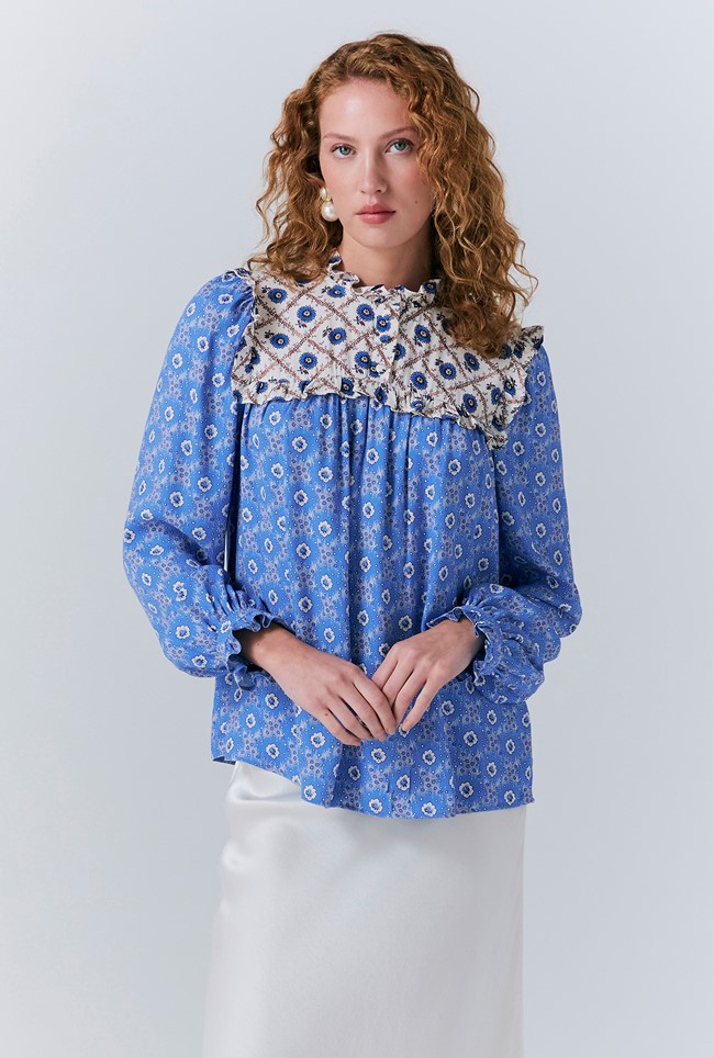 The Naomi blue floral blouse is a charming blend of whimsy and elegance, designed to elevate your everyday wardrobe. A delicate frill trims the neckline and cuffs, while a contrast yoke with matching frill detail adds a touch of playful sophistication. Crafted with a loose fit, it drapes effortlessly for all-day ease and movement. The button-up front features self-covered buttons, lending a thoughtful, tonal finish.