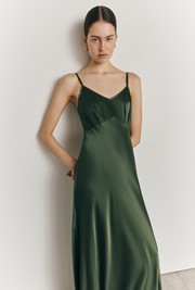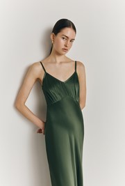 - A classic slip dress with adjustable straps, Winnie is as elegant as they come. Crafted from luxuriously soft satin in emerald green, she skims the silhouette beautifully, as does the empire line bust. Dress up with heels and a clutch.